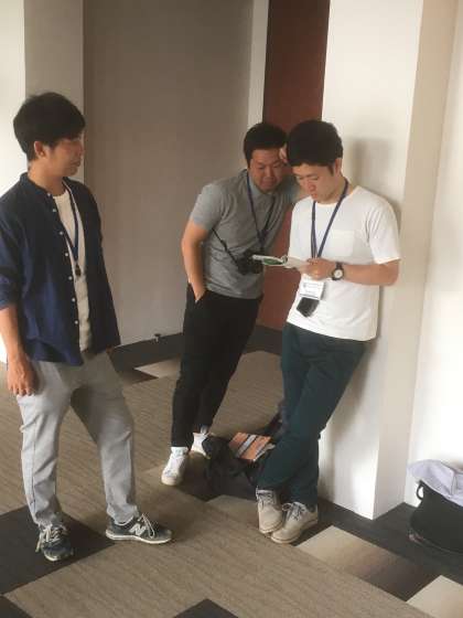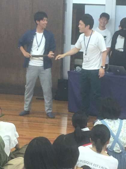 先生も,レクリエーション大会の盛り上げ役として,奮闘しています。打合せからの本番です。