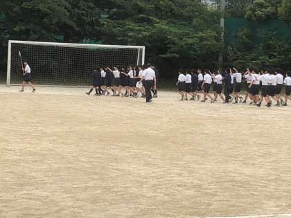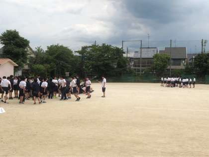 昨日の校外学習を無事終えた1・2年生は,体育大会の練習をしました。先日の全校練習が,雨で延期となったため,3年生が修学旅行で不在の中,学年練習を行いました。行進の練習や各競技の召集の練習をしました。行進は,各クラスオリジナルの掛け声とともに行います。体育大会当日には,掛け声にも注目してください。