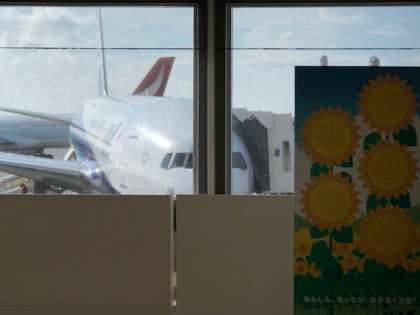搭乗待ちです。少しばかり疲れの色は,見えますが,まだまだ元気です。家に帰るまでが修学旅行です。いい意味での緊張感は持ってください。17時45分,那覇空港発の予定です。