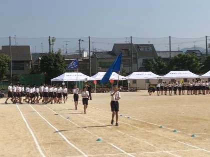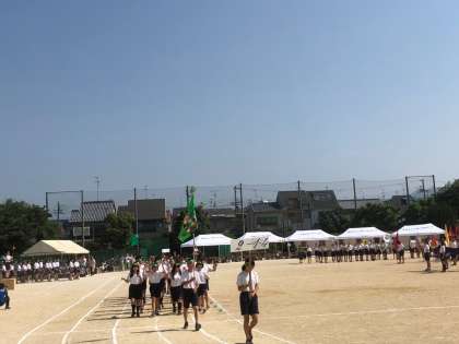 教職員もこの日のためにそろえた各色ごとのポロシャツで入場です。