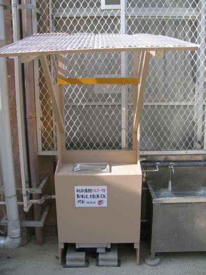 場所は北校舎と本館の間の通路そばです。設置にあたっては用務員さんと昨年度の校長先生にお世話になり、素晴らしい屋根とカバーをつけていただきました。