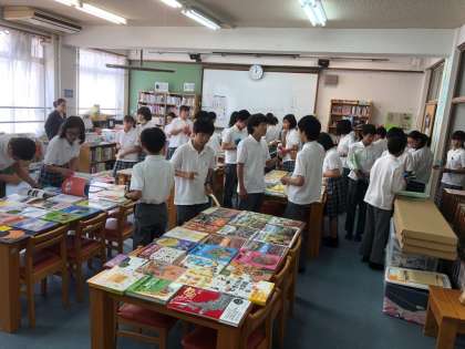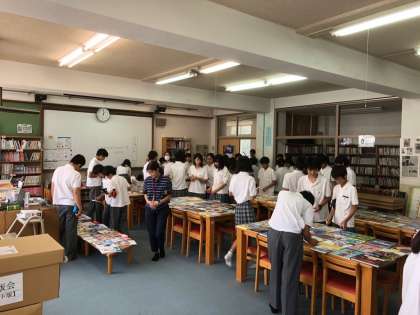 昼休みを利用して,全校生徒対象の選書会を実施しました。各学級の図書委員が,各学年で色分けされたしおりを参加生徒に配布をし,それぞれ興味のある書籍にしおりをはさんでいました。