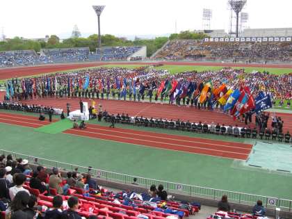全員が整列してから、国歌斉唱、京都市歌斉唱、京都市教育委員会教育長その他、来賓の方々の挨拶や激励の言葉があり、開会宣言、そして、各校の生徒会旗が集まってその中で選手代表の選手宣誓が行なわれました。