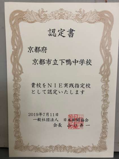 下鴨中学校が,NIE実践指定校に認定されました。