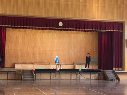 学年発表の舞台練習の様子です。舞台に立つ役者の生徒だけでなく,照明や音響の生徒も一緒に素晴らしい舞台を創ろうと力を合わせて頑張っています。