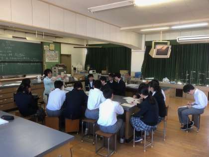 理科(化学)の授業の様子です。「化学反応の速さ」というテーマで学習をしました。化学反応が起こる条件から,反応の速さに影響する要因について考える学習をしました。