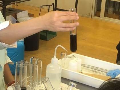 写真は,温度の違いによって化学反応を起こす速さを確かめる実験をしているところです。