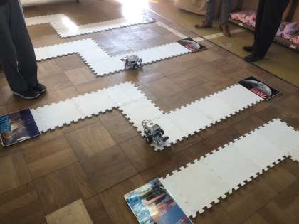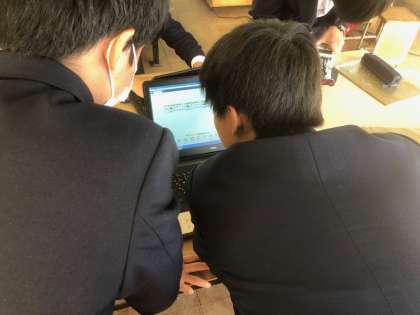 技術の授業の様子です。自立走行型ロボットのプログラミングを通じて,主体的に学ぶ授業を展開していただきました。自分たちでプログラミングしたロボットが,ルートを外れないようにうまく走行できるように試行錯誤しながら,パソコンに向かっていました。