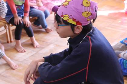 保育施設での活動です。滑り台あそびの補助をしているところです。園児の皆さんと楽しく活動していました。