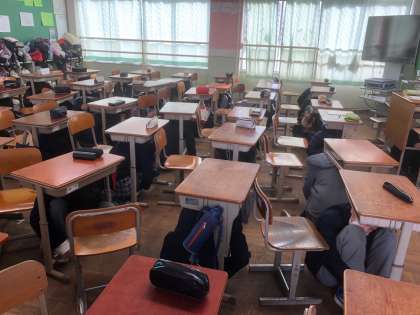 先日の水害を想定した避難訓練に続き,5限に避難訓練を行いました。今回は,地震と火災を想定しての避難訓練を行いました。1 姿勢を低くしてしゃがむ,2 体・頭を守る,隠れる,3 揺れが収まるまでじっとしている,動かない,待つ, 4 揺れが収まったら,速やかに屋外に出る,誰もができるものだとは思いますが,普段からの心構えと備えが大切です。
