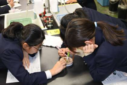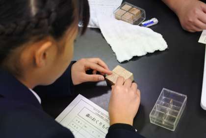 生物分野の学習です。「森のおくりもの」というタイトルで年輪パズルや実際に木を切り年輪を調べている様子です。