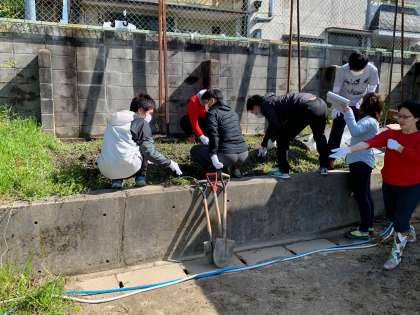 グランドの使用されていない場所を使い,1組の授業で使用する畑の準備をしています。