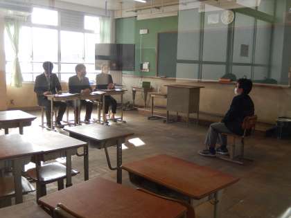 本日放課後,3年生の面接練習を実施しました。他学年の教員が面接官となり,普通教室を会場とし,本番を想定した机や椅子の配置で行いました。