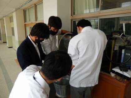 ウーパールーパーや金魚たちが生息している水槽の水を入れ換えています。他のメンバーは花の水やりに行っています。