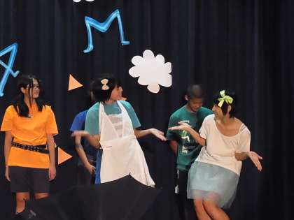 最初は、生徒会のオープニング劇で始まりました。一昨年度、生徒会で考案した下鴨中学校のキャラクターの「しもかもくん」も登場し、文化祭にかける意気込みを表現してくれました。この後、文化委員長の開会の言葉、学校長挨拶、生徒会の夏のリーダー研修会の報告と続きました。