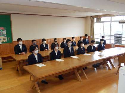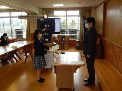 学級委員,生活委員,環境・保健委員,文化委員,図書委員,体育委員の認証を行いました。ハッピールームでは,各委員代表の3年生に校長先生から認証状が手渡され,生徒会執行委員がこれを見守りました。