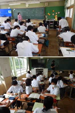 写真は1年生社会,美術,英語,理科,国語の様子です。
