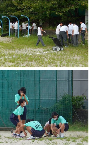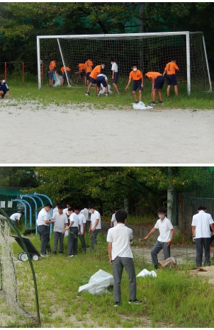 グラウンドで活動する部活動の部員が活動前の時間帯に集まって,草抜きに取り組みました。雑草はなかなか手ごわかったようです。