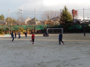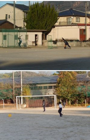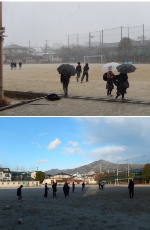 放課後、西風に雪が舞う中、グラウンドで活動を始めたラグビー部と野球部。その後は天候が落ち着き、寒い中で元気に活動しています。
