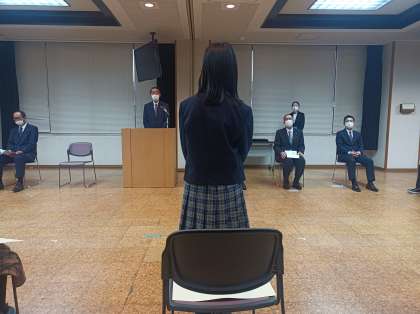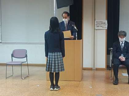 写真は3月23日に総合教育センターで行われた表彰式の模様です。2枚目は本人がスピーチしている場面です。
