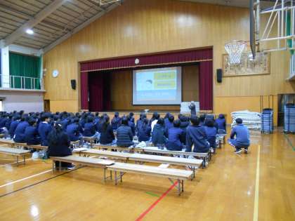 KDDIから講師の方に来ていただき、様々な事例から注意すべき点をお話しいただきました。ネットの世界は便利なだけに、自分自身で気を付けないと様々な落とし穴があることがわかり、これからに役立つ授業となりました。