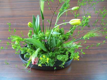 玄関には、サンシュユの黄色の花、白色のストック、赤色と白色の混じったスプレーカーネーション(花が枝分かれして咲く)を、会議室には小さな白い花の咲くユキヤナギ、赤色と黄色のチューリップ、黄色のナノハナ、すっと伸びた緑色のムギの穂、を生けて下さいました。3年生の卒業を祝ってくれているようです。ありがとうございます。