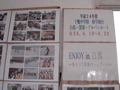 職員室前に修学旅行の様子の写真が掲示されています。