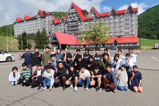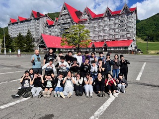 ホテルをバックに集合写真を撮りました。