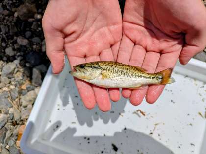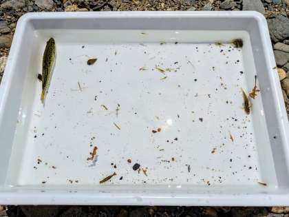 トビゲラ、コオニヤンマ、カワニナ、小エビ、魚(バスの仲間)、魚の稚魚がたくさん見られました。水中眼鏡で見ると、川の中の世界が一変して、生物が生活している様子がわかります。