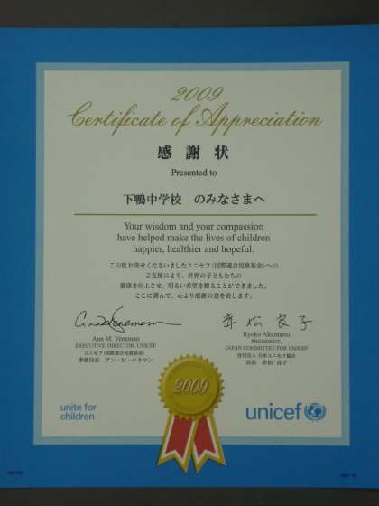 ユニセフ協会から生徒会に感謝状が届きました。