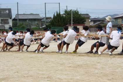 色別対抗戦(女子,男子対抗)やクラス対抗,色別混合対抗でおこなう三連綱引き大変盛り上がりました。必死で仲間を応援!