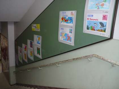 下鴨中本館の階段の壁面に美術の作品を「下鴨画廊」として掲示してあります。現在,「京都市児童生徒作品展」に出品された作品や「2年生夏休み課題作品」を掲示してあります。どの作品も力作ぞろいです。