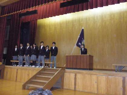 最初に前生徒会長から退任の挨拶がありました。いろいろな苦労をともにした旧執行委員一人ひとりの心のこもった紹介をしてくれました。続いて新しい生徒会長から決意表明がありました。そして前生徒会長から新生徒会長へ「生徒会旗」が引き継がれ,大きな声援の拍手に包まれました。