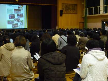 本日の5時間目6時間目を使って3年生と全学年保護者対象に進路説明会が行われました。今回は京都府立北稜高等学校と京都学園高等学校から先生に来ていただき,公立高校と私立高校の特徴や進路に対する心構え等をお話いただきました。3年生も学校祭が終わり,そろそろ落ち着いて進路に対して目を向けることができるようになってきたようです。静かに話が聴けていたようです。