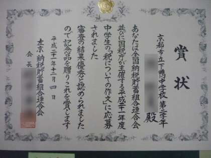税についての作文 校長室で表彰していただきました