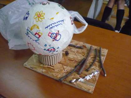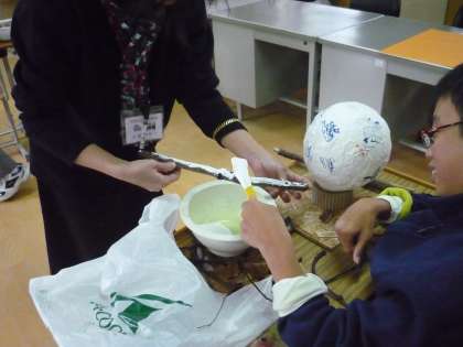 ゴム風船を中に入れて作った和紙シェードの飾り付けをしています。和紙にも自分のお気に入りのデザインや文字を描き,台には木の実や枝などを張って飾り付けをしています。