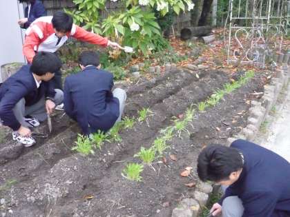 1組の畑は夏はナスやきゅうり,プチトマトを栽培していましたが,今はミズナとタマネギを植えつけています。