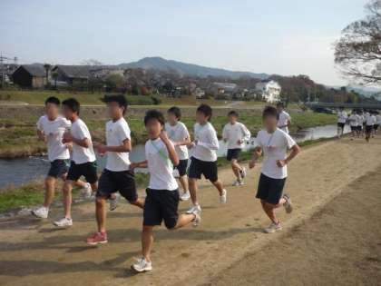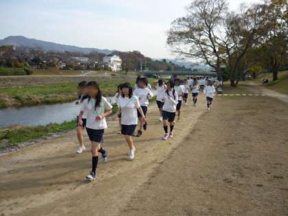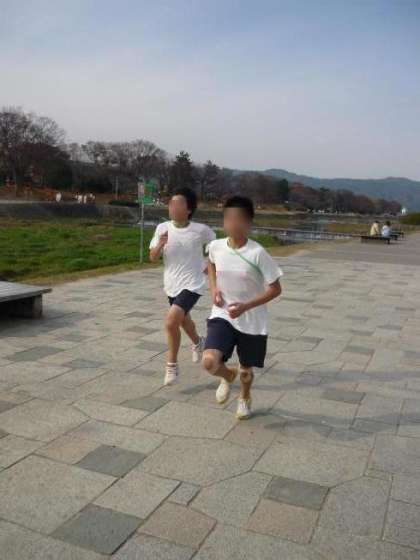 3年生はから,2年生,1年生の順で高野川と加茂川の合流する三角州付近からのスタートとなりました。女子は御薗橋までの往復で約7キロ,男子は西賀茂橋までの往復で約9キロのコースを走りました。たくさんの橋を越えていくコースでしたが,「次の橋まで」という短めの目標をつなげることで大きな目標の達成につながったようです。