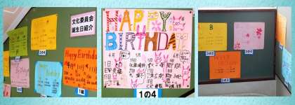 階段の掲示板には,文化委員作成の「誕生日ポスター」が掲示されています。それぞれにとって大切な記念の日。「おめでとう。」と声をかけあい,命を与えてくれた親に感謝し,互いの存在を大切にできる生徒であってほしいと願います。