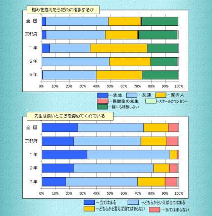 この2つの設問については,大変残念な結果が出ています。先生と生徒が,互いに信頼する関係にないことが浮き彫りになっています。この結果については早くに教職員全員で共有していますが,日ごろのちょっとした言葉がけ一つで,生徒の受け止め方が大きく変わることを胸に刻んで教育活動に当たりたいと思います。