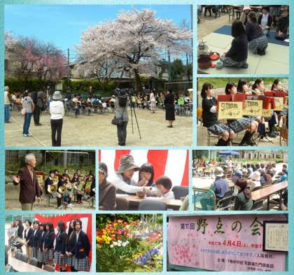 折からの風に桜吹雪が舞う中,第11回野点の会が開かれました。夜来の雨も上がり,気持ちの良い天候で,大勢の方においでいただきました。