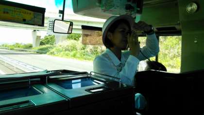 琉球村からバスに乗車し、いよいよ伊江島へ渡る為の本部港に向かいます。バス内では、明るくて楽しいバスガイドさんから夢のある沖縄の歴史と素晴らしい歌声の沖縄民謡などを紹介していただいています。
