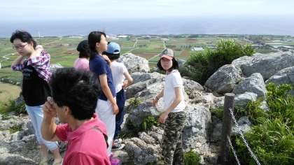 本日は、各家庭で午前8時頃より活動が開始されました。伊江島中央から少し東の標高172,2M 城山(グスクヤマ)へ多くの班が集まっています。180度パノラマで美しい伊江島全体が見られます。風がとても心地よくて、京都では味わえないような場所です。また下山すればお土産もの屋さんもあり、みんなそれぞれ気に入った品を購入しているようです。