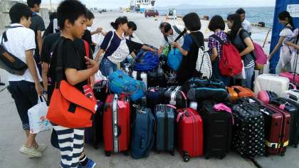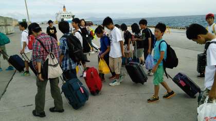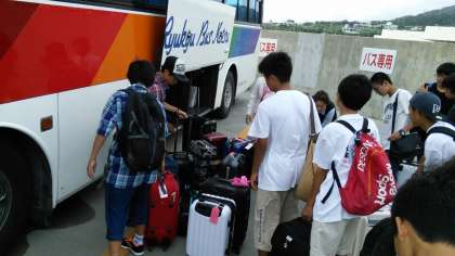 生徒達は日に焼けて、やや疲れた表情をしていますが元気です。本部港から1時間半くらいバスに乗ります。きっとバスの中では『おやすみタイム』かも・・・ですね。