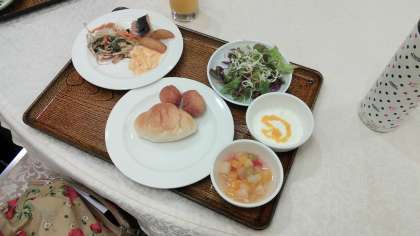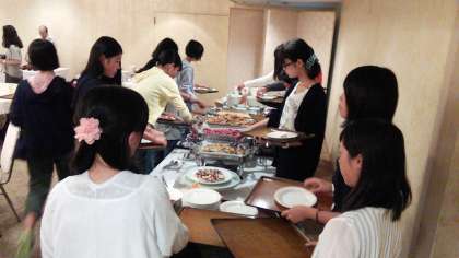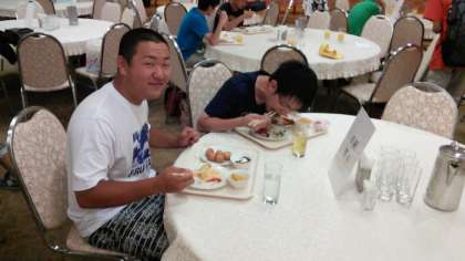 おはようございます。昨夜から断続的に降り続いていた雨も、今朝はやんでいます。少ししのぎやすい気候に変わっているようです。今日の夕方には京都に戻ります。生徒達の朝食のシーンをお届けします。