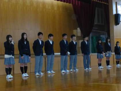 3年生は,今年の反省を各学級で話し合い,それを学級委員が良かったこと・悪かったこととしてまとめて発表しました。受験を目前に控えて,再度自分達の生活と学習を見つめ直し,あと数ヶ月しかない中学校生活を卒業に向けてしっかり過ごしていこうとみんなで確認し合いました。