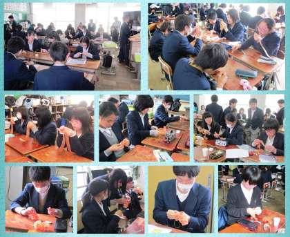 今日の本日5・6時間目に2年生は,卒業式で3年生が胸につけるコサージュの制作を行いました。先日講習を受けた制作リーダーを中心に,各班で協力して行いました。初めて制作する生徒がほとんどで,かなり苦労していましたが,お互いに協力して完成させていきました。