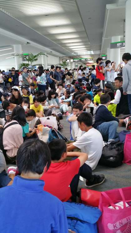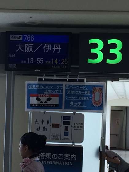 只今,那覇空港発の飛行機が30分遅れの14時25分発に変更する旨,連絡がありました。前の便が遅れたことによる遅延だということです。事故等ではございませんのでご安心下さい。