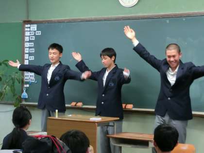 3年生は、修学旅行でつけた力を次に生かそうと、いろいろな場面で頑張っています。体育大会の色別応援アピールの取り組みは、各クラスから選ばれた応援団のメンバーが知恵を出し合い、手拍子や掛け声で、士気を高めようと3分間のプログラムを作成中。