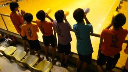 しかしながら,緊張や不安のある表情を見せずに,全力疾走していた選手に惜しみない拍手が送られていました。そして・・・会場から大声援を送っていた男子部員!元気いっぱいの応援ぶりに感動しました。